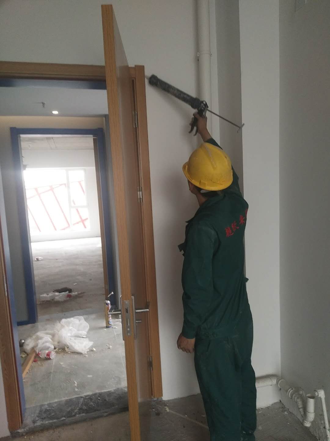 2018年5月6日工師傅們?cè)趯?shí)施***后一道工序打膠并打掃衛(wèi)生。